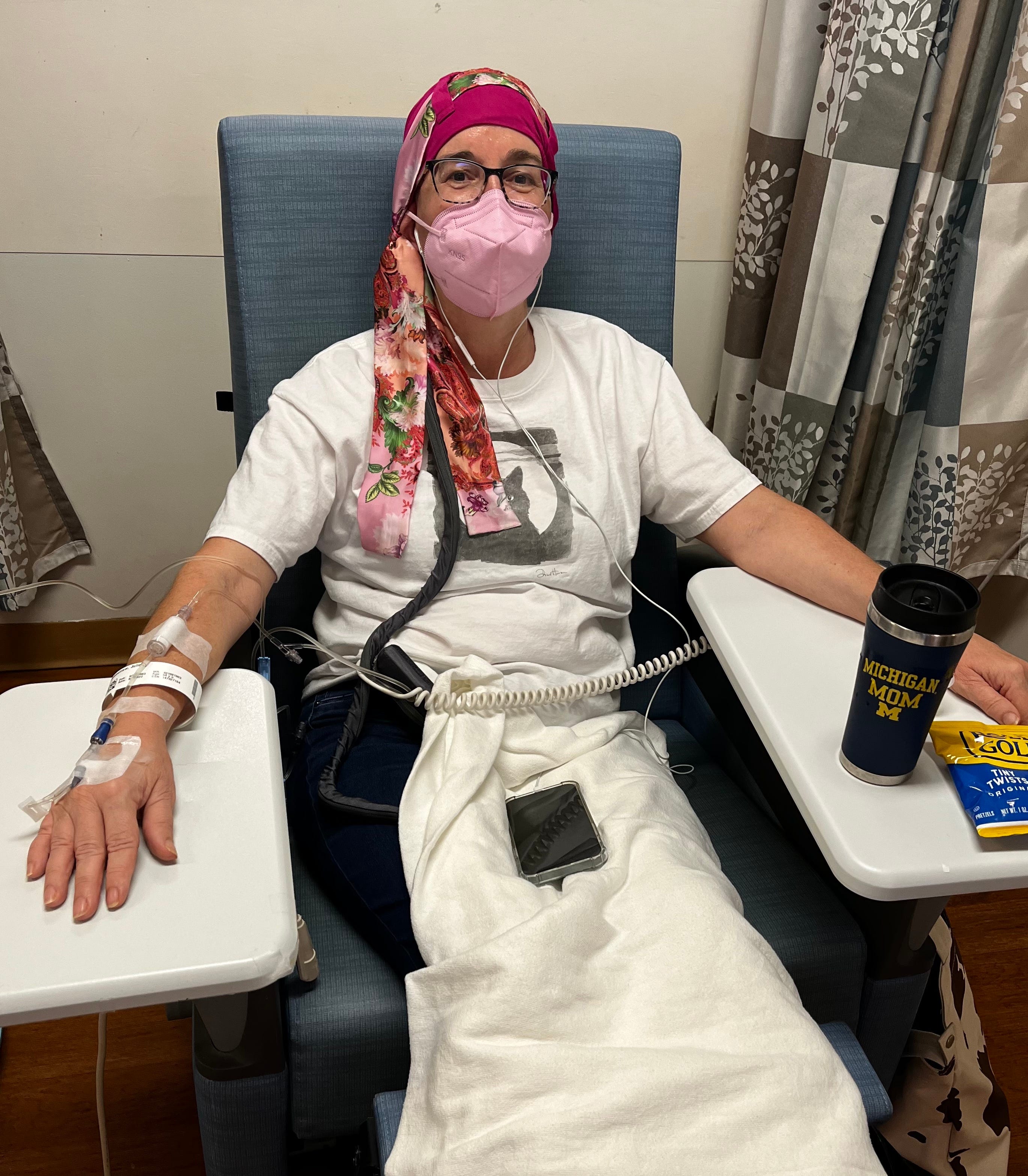 Julie relaxing with a podcast and plenty of Michigan Mom hydration during a recent infusion chair session (pembrolizumab + infliximab). Note the presence of the Optune TTF system as a key part of Julie’s customized, combination treatment regimen. To learn more about the design, implementation and clinical course of Julie’s treatment regimen as well as the members of Team Julie who made it all possible, we invite you to visit “An Open Letter to Team Julie”.