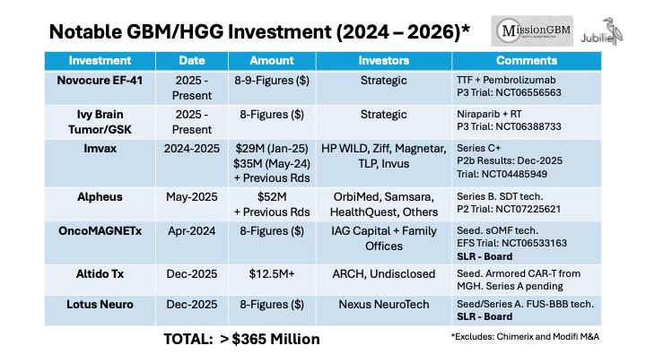 Over the past several decades, it has been challenging to attract meaningful investment for the development of new treatments for brain cancers. In particular, GBM or high grade gliomas (HGGs) are considered “radioactive” by many institutional and strategic investors owing to a dismal track record of clinical failures coupled with modest total addressable market size.